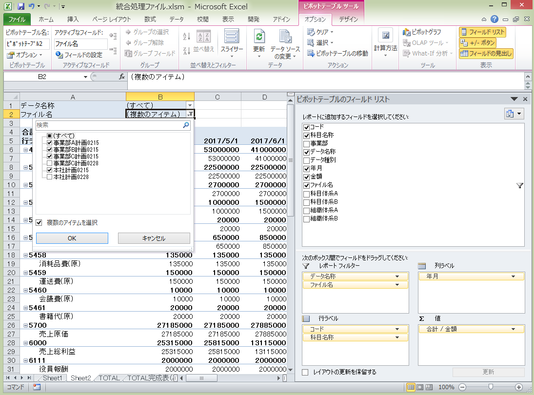 次に④で作成したピボットテーブルにおいて、”ファイル名”をクリックし、”複数のアイテムを選択”というチェックボックスを選択し、ファイル名を選択すれば、新しい統合ファイルの情報がピボットに反映されます。