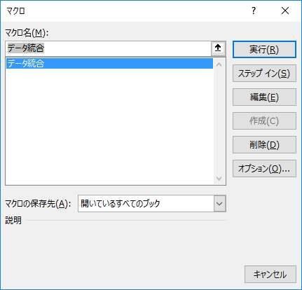 1) メニュー⇒表示⇒マクロにて、「データ統合」を選択し実行します。